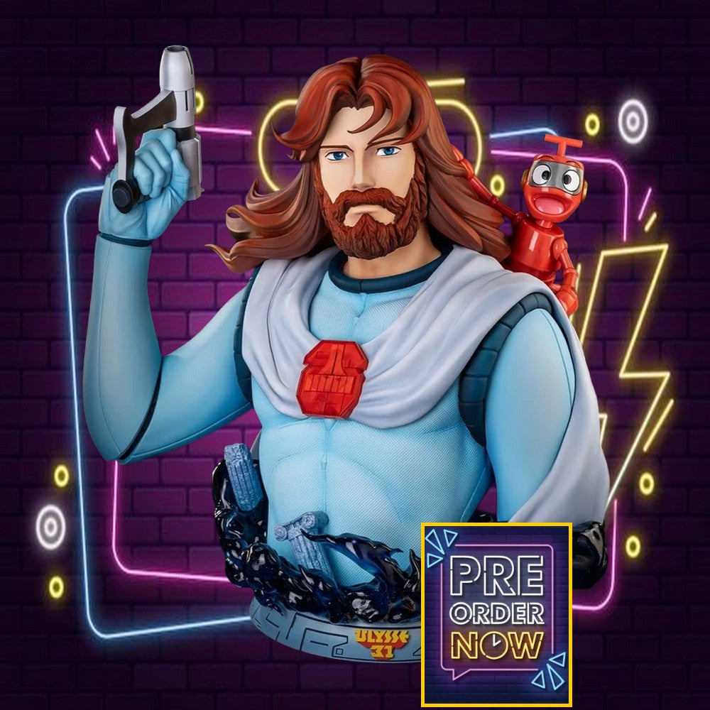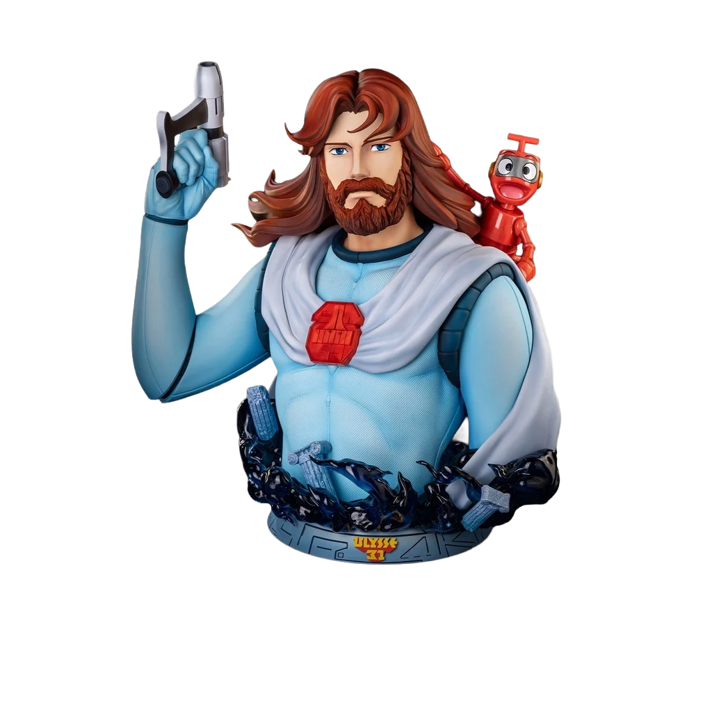 Dans une pose museum, Ulysse se tient droit, déterminé, accompagné de son fidèle robot Nono, perché sur son épaule. Le pistolet dans sa main droite évoque les combats et les voyages périlleux à travers les étoiles.